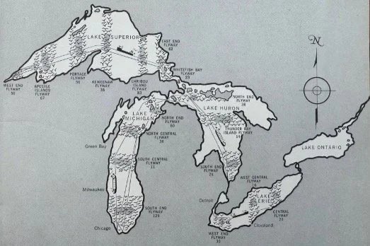 After decades of sailing the Great Lakes, Captain Perkins could predict when his freighter would enter any one of 17 different flight corridors that hosted massive numbers of migrating birds. He documented and told stories of his bird migration observations through a film production he called Birds Ahoy. He also created a hand-drawn corridor map to educate the public and scientific community about these over water movement corridors.