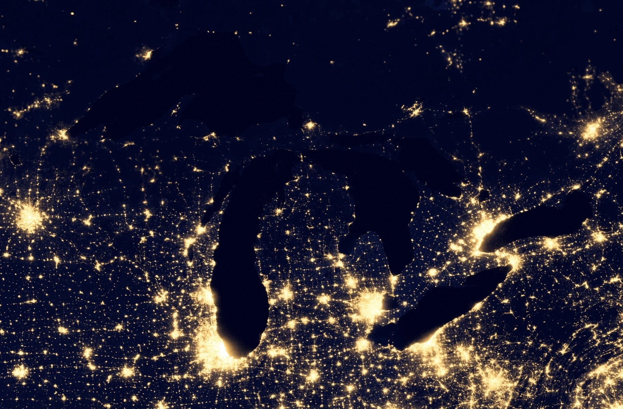 ATTRACTED TO COASTAL GLOW. Nocturnally migrating birds are drawn to artificial light and disproportionately concentrate their movements and stops within Great Lakes coastal cities. Within these ‘light halos,’ mortality caused by collisions with structures and predation by house cats is intensified.