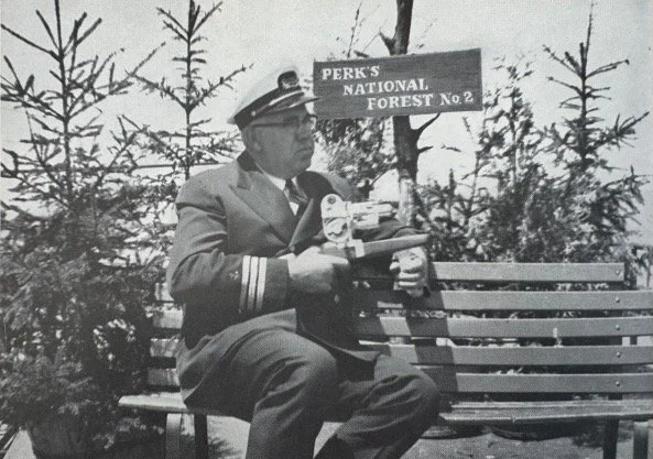 From 1928 to 1972, Captain J. P. “Perk” Perkins sailed the Great Lakes onboard freighters that carried ore and other cargo between Lake Superior and Lake Erie. Perk had a unique passion for birds. For the majority of his life as a mariner, Perk recorded the migratory birds that sought shelter on his ships. He placed a cobbled assortment of potted trees on his freighter's deck to attract and better film the birds, an assemblage the crew named Perk’s National Forest.