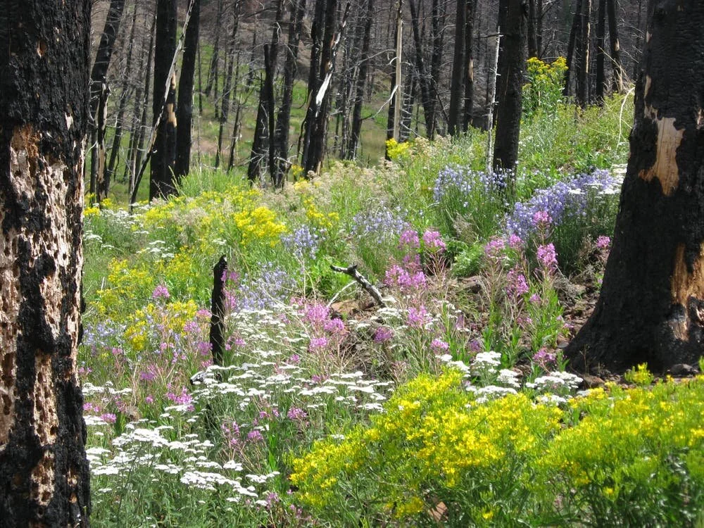 NEW OPPORTUNITIES, SHOSHONE NATIONAL FOREST, WYOMING. Wildflowers and the pollinators that depend upon them flourish three summers after the Gunbarrel Fire burned just east of Yellowstone in 2008. Historically, fires created patchy mosaics of habitat releasing resources and creating new edge habitats and niche spaces. Photo: Monica Turner.