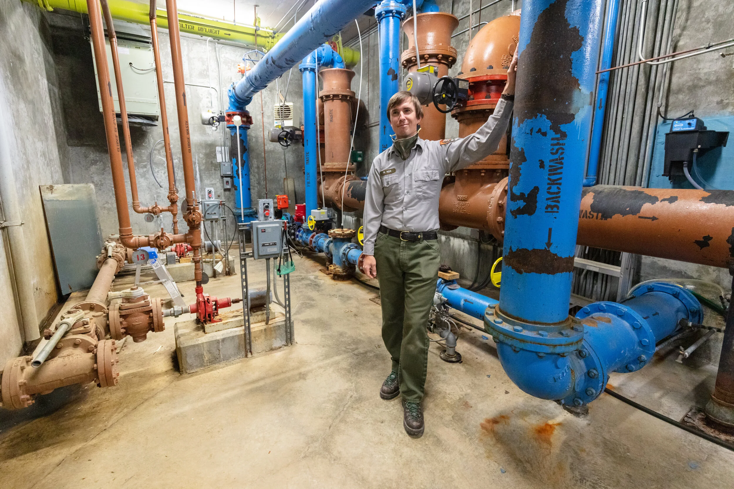 ENVIRONMENTAL ENGINEER, MAMMOTH HOT SPRINGS. This utility systems operator provides clean water and waste management for Yellowstone’s 4 million visitors. It takes over a dozen villages comprising 800 National Park Service employees and thousands of park partners working behind the scenes to get the park through a busy summer season. Photo: Jacob Frank.